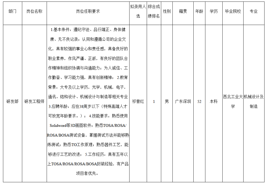 根據(jù)深圳九州光電子技術(shù)有限公司發(fā)布的招聘公告及招聘相關(guān)規(guī)定,經(jīng)筆試、面試、考察、體檢等程序,擬錄用祁普紅同志到深圳九州光電子技術(shù)有限公司工作,現(xiàn)予以公示,具體情況如下: