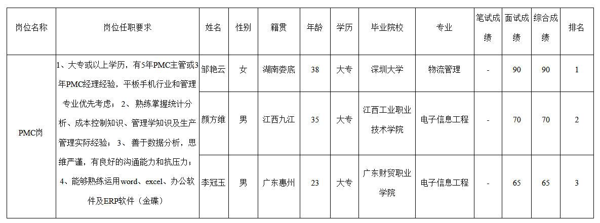 根據(jù)深圳市九洲智和科技有限公司發(fā)布的招聘公告及招聘相關(guān)規(guī)定,經(jīng)筆試、面試等程序,現(xiàn)將筆試(面試)成績予以公示。