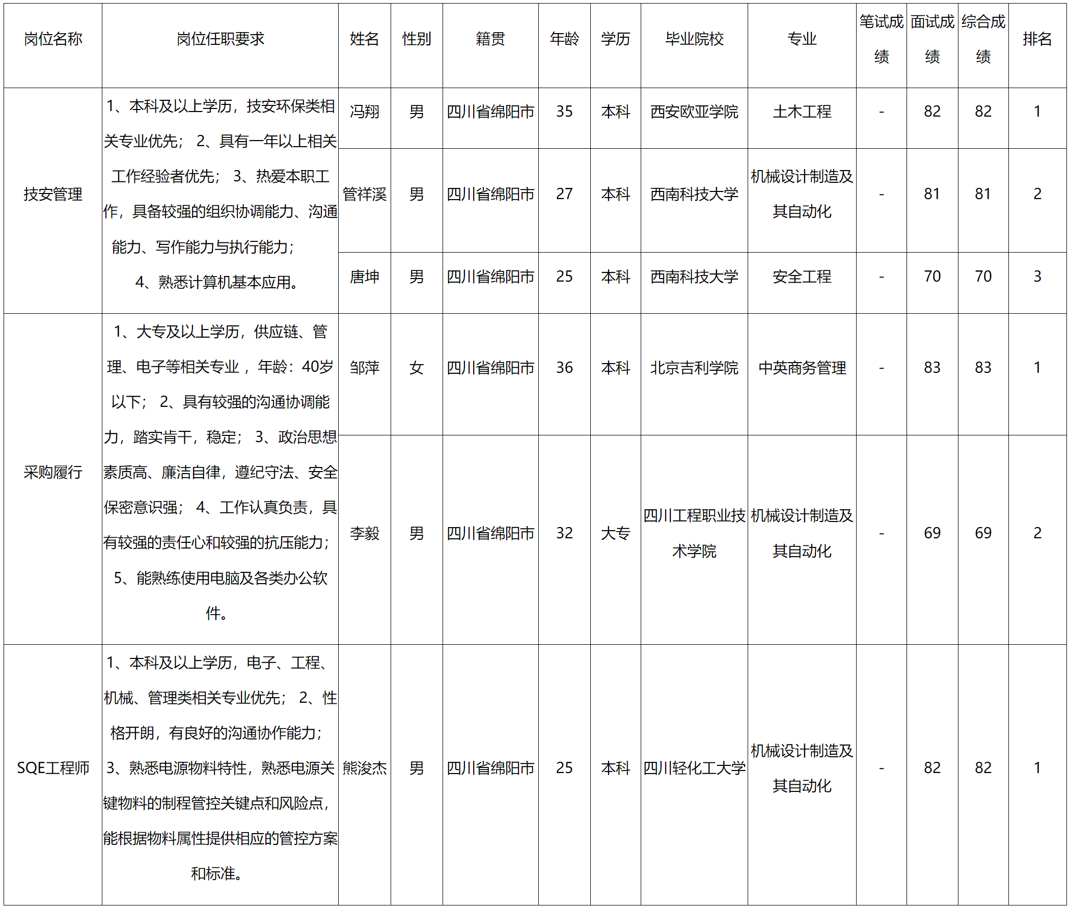 根據(jù)四川九州電子科技股份有限公司發(fā)布的招聘公告及招聘相關(guān)規(guī)定,經(jīng)筆試、面試等程序,現(xiàn)將筆試(面試)成績予以公示。