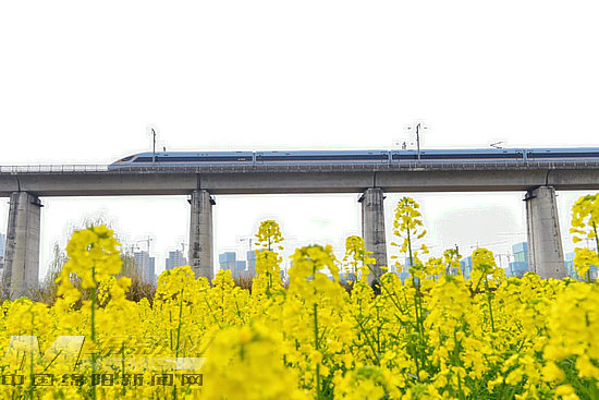 在艷陽(yáng)下的游仙區(qū)石馬鎮(zhèn),一列列動(dòng)車(chē)組從油菜花海旁駛過(guò),穿行在春天里。