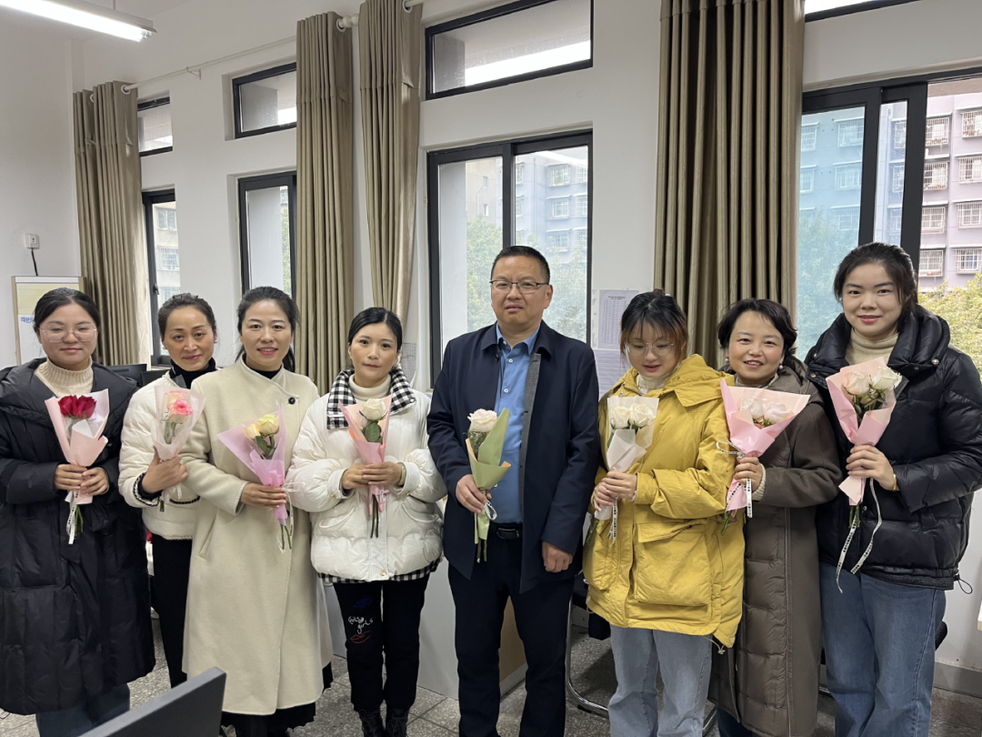 上午8時(shí)30分,該校領(lǐng)導(dǎo)肖義輝、龍?zhí)?、陳誠等分年級(jí)組向女教職工們送去節(jié)日的慰問,感謝和致敬她們在學(xué)校工作中的貢獻(xiàn)和付出。老師們收到鮮花都情不自禁地露出了微笑,驚喜與感動(dòng)在眼角綻放。