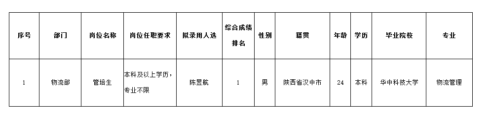 根據(jù)四川波鴻實業(yè)有限公司發(fā)布的招聘公告及招聘相關規(guī)定,經(jīng)面試等程序,擬錄用以下人員為威斯卡特工業(yè)(中國)有限公司管培生,現(xiàn)予以公示,具體情況如下: