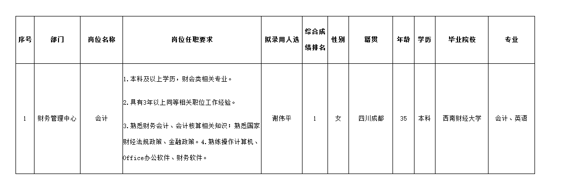 根據(jù)四川波鴻實(shí)業(yè)有限公司發(fā)布的招聘公告及招聘相關(guān)規(guī)定,經(jīng)面試等程序,擬錄用以下人員為四川波鴻實(shí)業(yè)有限公司會(huì)計(jì),現(xiàn)予以公示,具體情況如下: