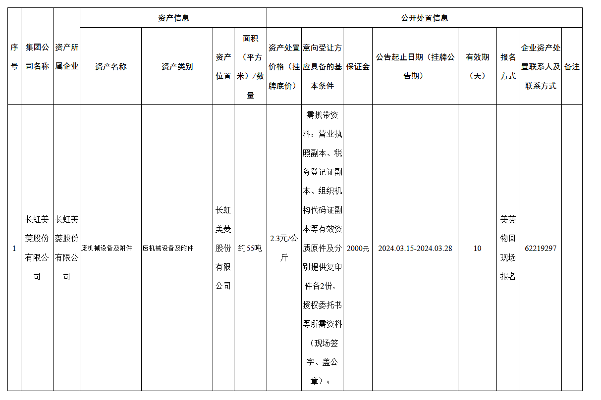 長虹美菱股份有限公司資產(chǎn)處置公告