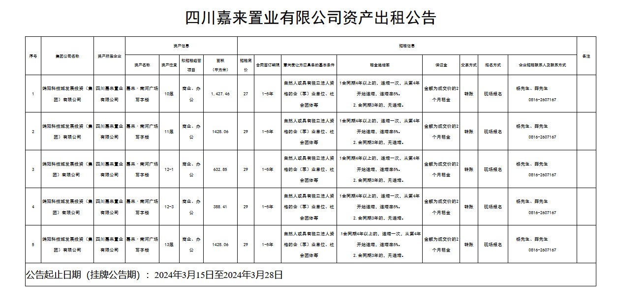 四川嘉來置業(yè)有限公司資產(chǎn)出租公告