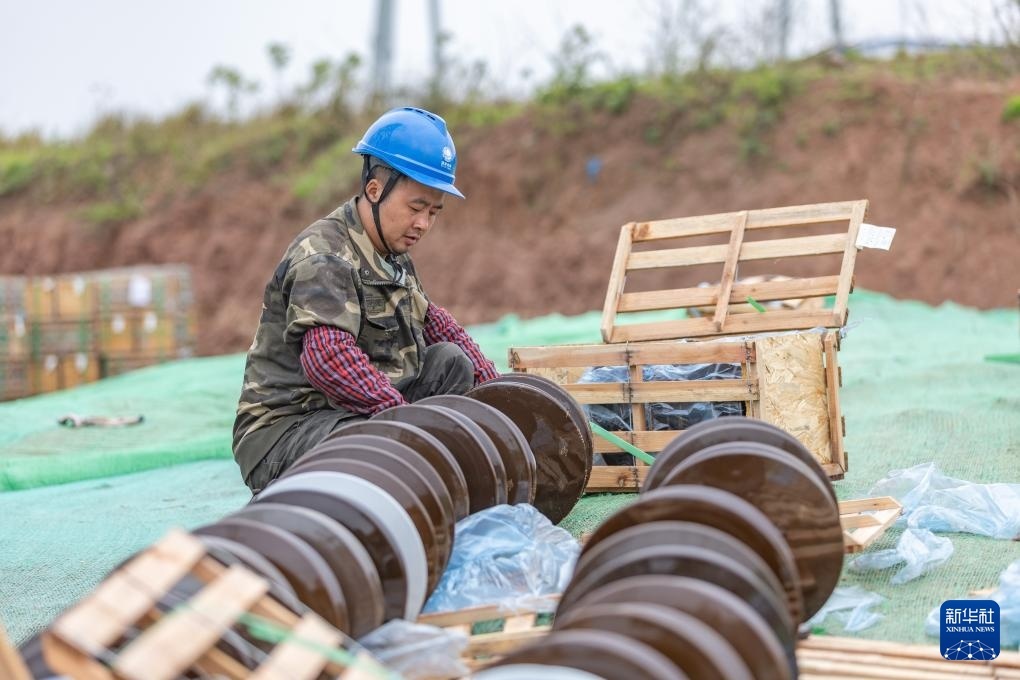 3月17日,在位于重慶市銅梁區(qū)少云鎮(zhèn)的川渝1000千伏特高壓交流工程施工現(xiàn)場(chǎng),施工人員在安裝絕緣子。