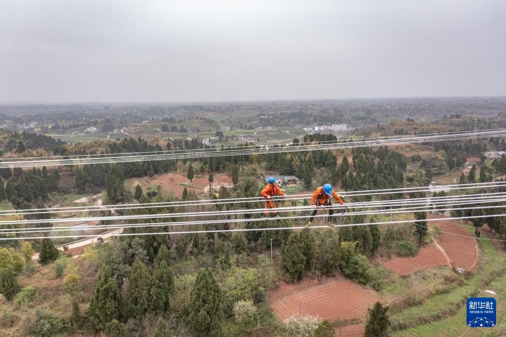 3月17日,施工人員在位于重慶市銅梁區(qū)少云鎮(zhèn)的川渝1000千伏特高壓交流工程施工現(xiàn)場(chǎng)作業(yè)(無人機(jī)照片)。