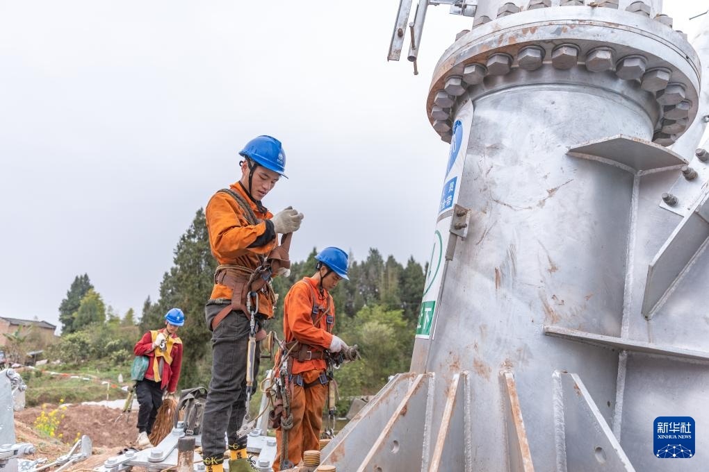 3月17日,施工人員在位于重慶市銅梁區(qū)少云鎮(zhèn)的川渝1000千伏特高壓交流工程施工現(xiàn)場(chǎng)作業(yè)。