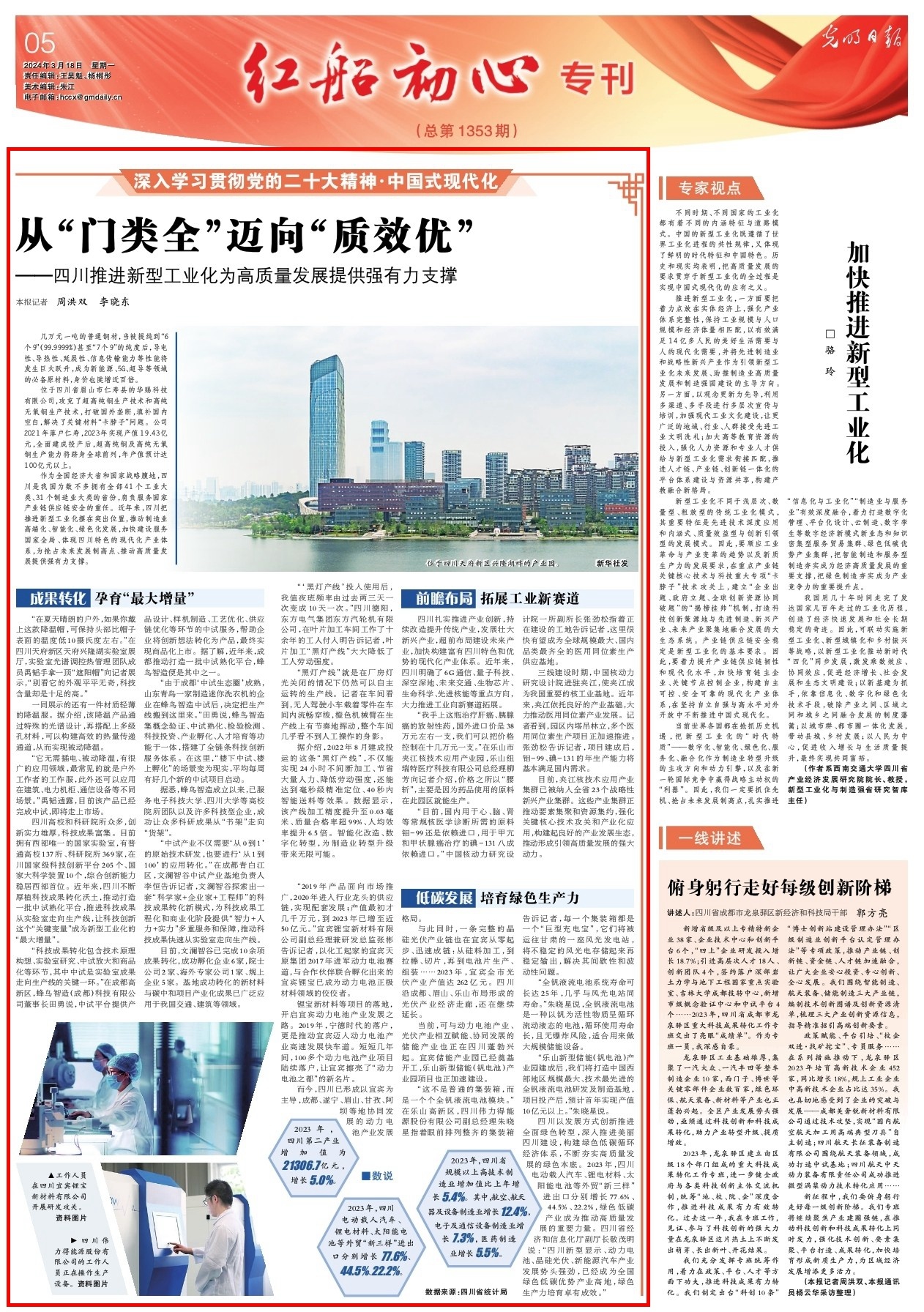 作為全國(guó)經(jīng)濟(jì)大省和國(guó)家戰(zhàn)略腹地,四川是我國(guó)為數(shù)不多擁有全部41個(gè)工業(yè)大類、31個(gè)制造業(yè)大類的省份,肩負(fù)服務(wù)國(guó)家產(chǎn)業(yè)鏈供應(yīng)鏈安全的重任。近年來(lái),四川把推進(jìn)新型工業(yè)化擺在突出位置,推動(dòng)制造業(yè)高端化、智能化、綠色化發(fā)展,加快建設(shè)服務(wù)國(guó)家全局、體現(xiàn)四川特色的現(xiàn)代化產(chǎn)業(yè)體系,為搶占未來(lái)發(fā)展制高點(diǎn)、推動(dòng)高質(zhì)量發(fā)展提供強(qiáng)有力支撐。