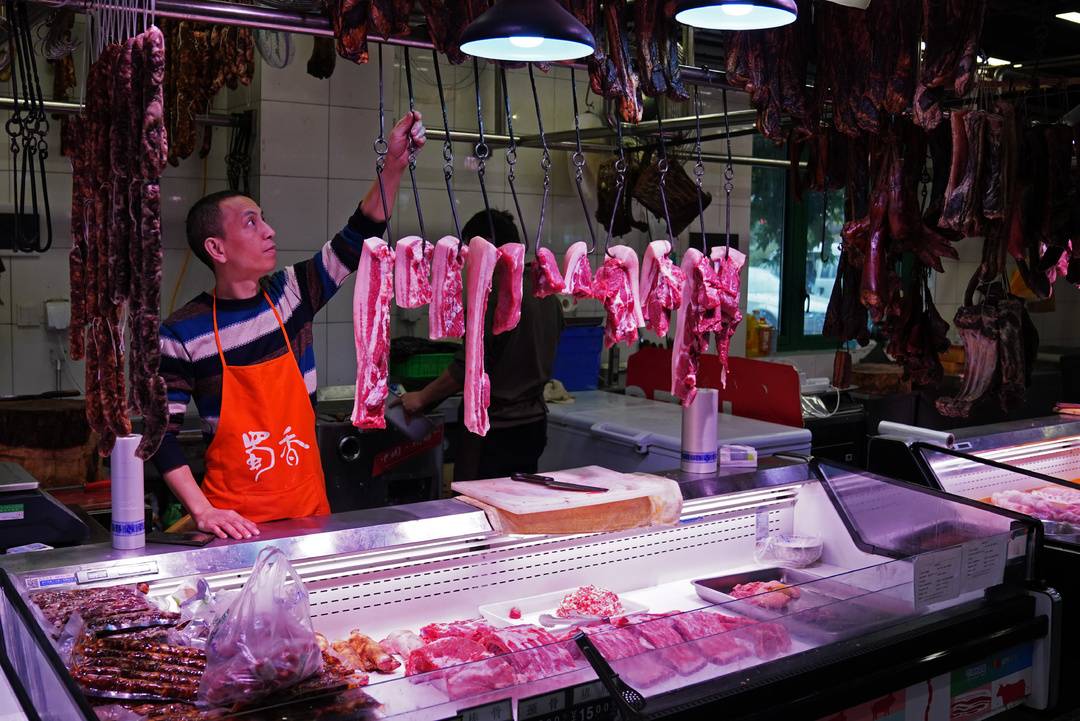 近日,成都高新區(qū)錦城大道附近的益民菜市里,在肉類區(qū)一個(gè)攤位記者看到,上面一排排整齊地掛著新鮮豬肉、臘肉和香腸等,下面冰柜里擺著豬蹄、豬內(nèi)臟等。