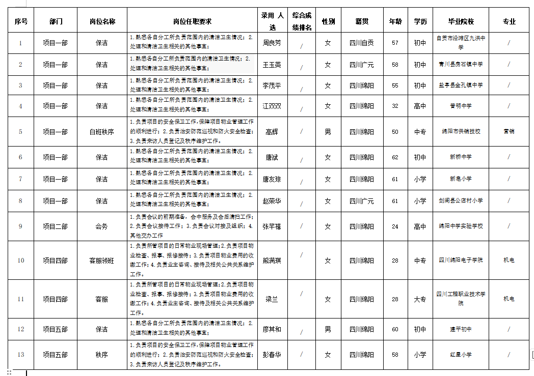 根據(jù)綿陽市康來物業(yè)服務(wù)有限公司發(fā)布的招聘公告及招聘相關(guān)規(guī)定,經(jīng)面試、試用等程序,錄用以下人員到綿陽市康來物業(yè)服務(wù)有限公司各項(xiàng)目部工作,現(xiàn)予以公示,具體情況如下: