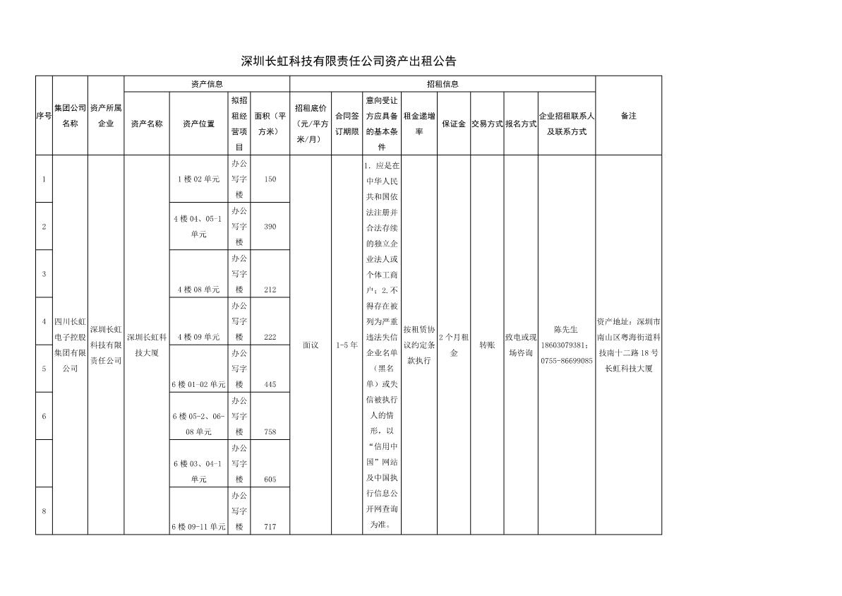 深圳長(zhǎng)虹科技有限責(zé)任公司資產(chǎn)出租公告