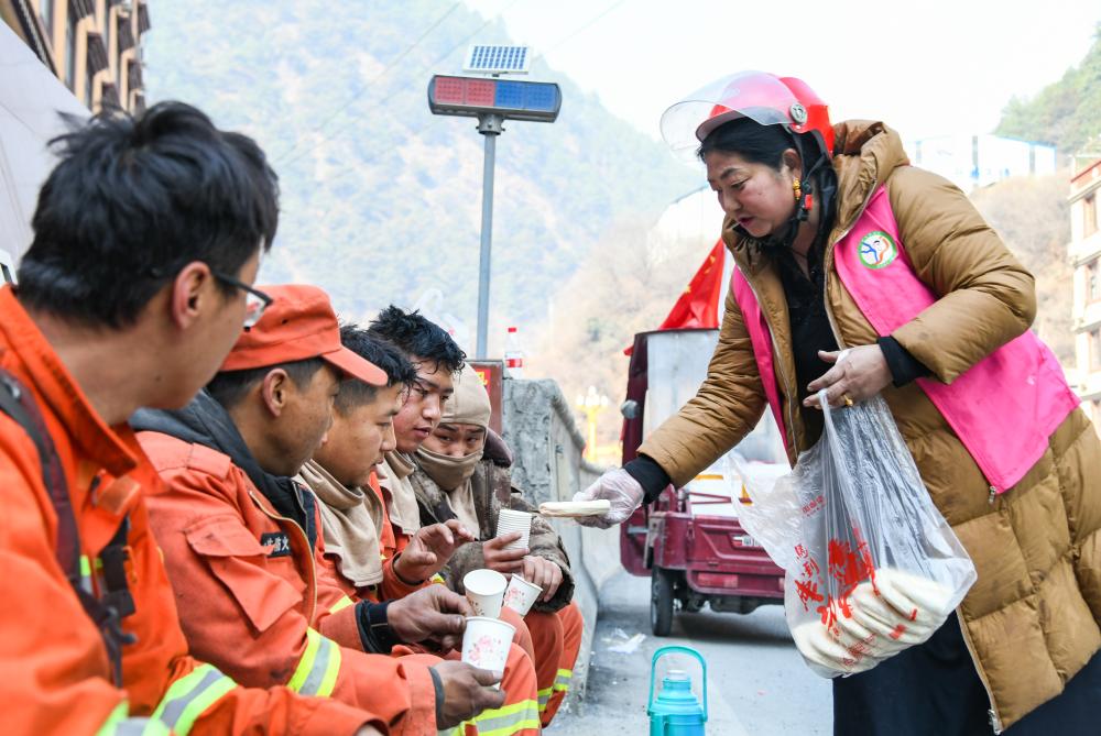 3月18日,在四川省甘孜藏族自治州雅江縣,彭三妹(右)為參加救援的消防員送熱水。
