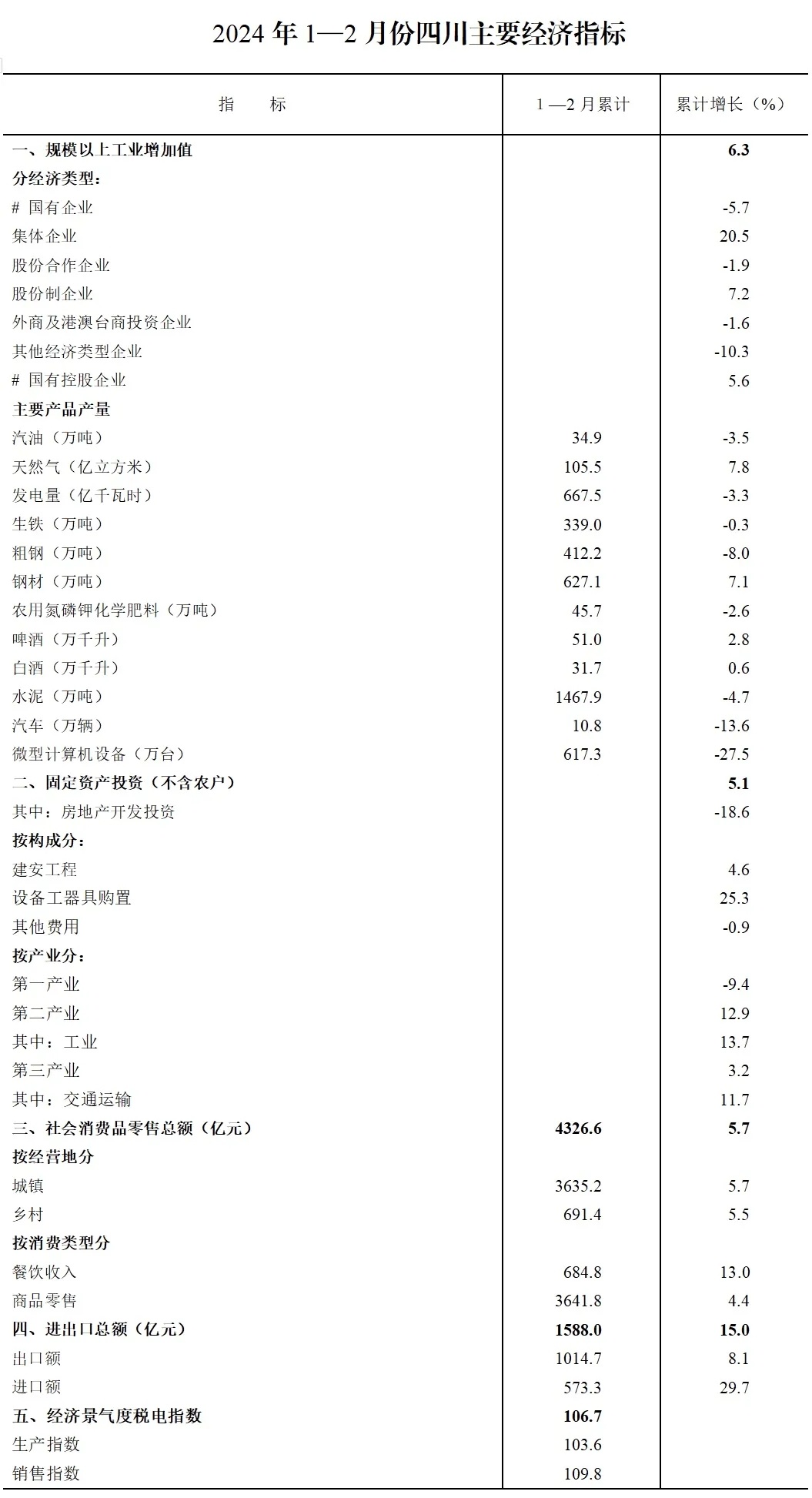 3月19日,四川省統(tǒng)計(jì)局發(fā)布今年1至2月四川省國(guó)民經(jīng)濟(jì)主要指標(biāo)數(shù)據(jù)。數(shù)據(jù)顯示,1—2月,全省規(guī)模以上工業(yè)增加值同比增長(zhǎng)6.3%;全省實(shí)現(xiàn)社會(huì)消費(fèi)品零售總額4326.6億元,同比增長(zhǎng)5.7%,經(jīng)濟(jì)運(yùn)行起步平穩(wěn),延續(xù)了回升向好態(tài)勢(shì)。