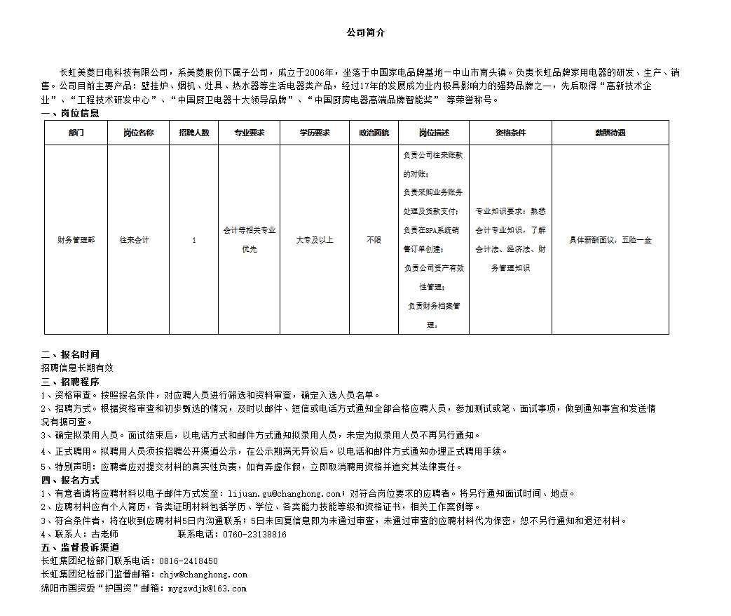 長(zhǎng)虹美菱日電科技有限公司關(guān)于招聘往來(lái)會(huì)計(jì)的公告