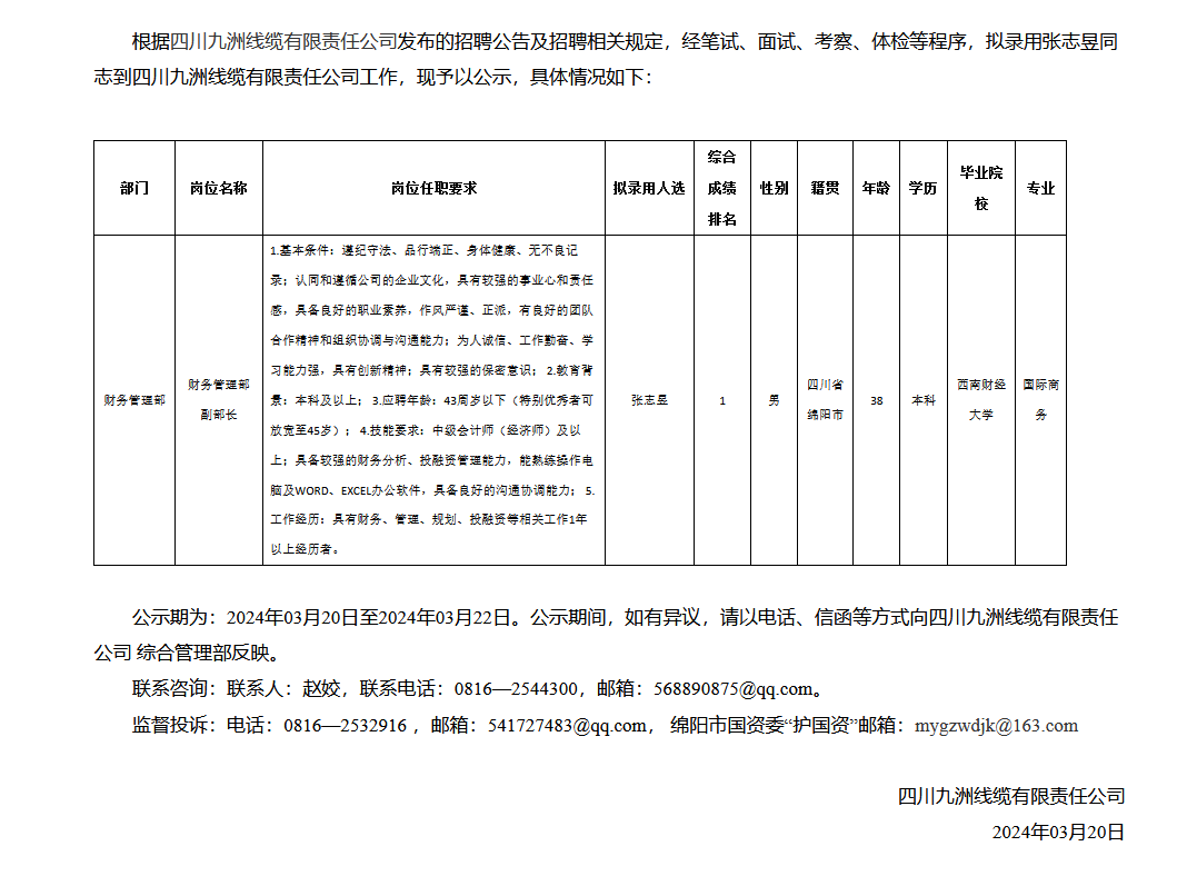 四川九洲線纜有限責(zé)任公司關(guān)于招聘財務(wù)管理部副部長擬錄用人員的公示
