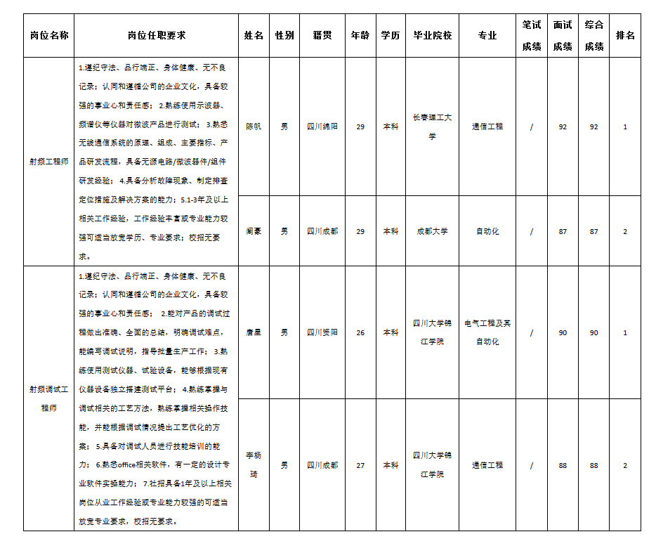 根據(jù)四川九強(qiáng)通信科技有限公司發(fā)布的招聘公告及招聘相關(guān)規(guī)定,經(jīng)筆試、面試等程序,現(xiàn)將筆試(面試)成績(jī)予以公示。