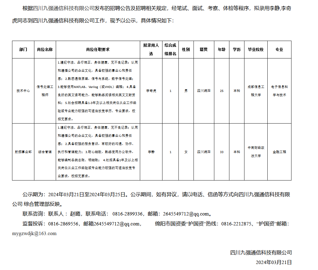 四川九強(qiáng)通信科技有限公司關(guān)于招聘綜合管理等崗位擬錄用人員的公示