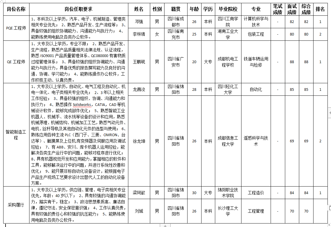 根據(jù)四川九州電子科技股份有限公司發(fā)布的招聘公告及招聘相關規(guī)定,經(jīng)筆試、面試等程序,現(xiàn)將筆試(面試)成績予以公示。