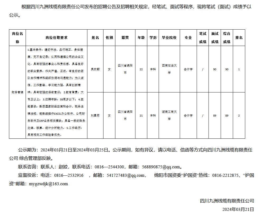 四川九洲線纜有限責(zé)任公司關(guān)于招聘財(cái)務(wù)管理崗成績(jī)的公示