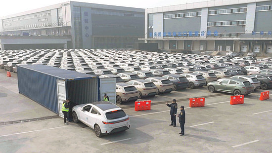 重慶海關(guān)關(guān)員驗放出口新能源汽車(成都海關(guān)供圖)