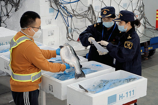 成都海關(guān)關(guān)員查驗進口三文魚(成都海關(guān)供圖)