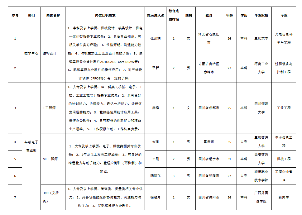 根據(jù)四川九州電子科技股份有限公司發(fā)布的招聘公告及招聘相關(guān)規(guī)定,經(jīng)筆試、面試、考察、體檢等程序,擬錄用任泳婧,平昕,劉盾,王剛,陳躍飛,唐梅,徐越月同志到四川九州電子科技股份有限公司工作,現(xiàn)予以公示,具體情況如下: