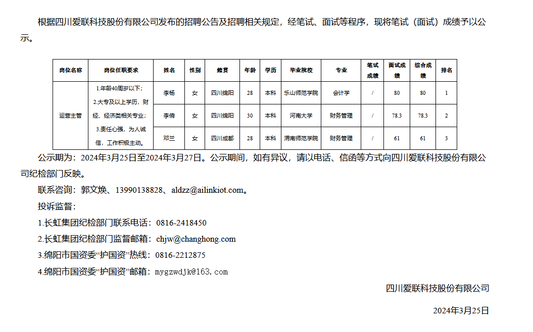 四川愛聯(lián)科技股份有限公司關于招聘運營主管成績的公示