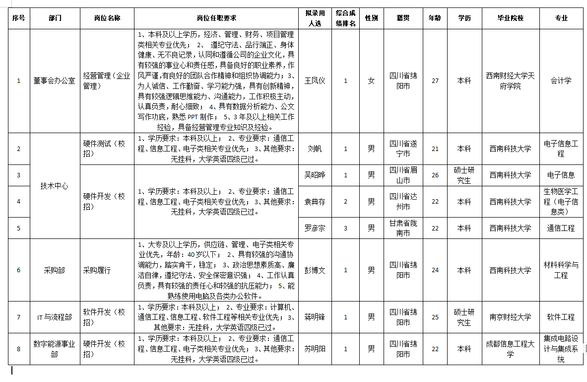根據(jù)四川九州電子科技股份有限公司發(fā)布的招聘公告及招聘相關(guān)規(guī)定,經(jīng)筆試、面試、考察、體檢等程序,擬錄用王鳳儀,彭博文,吳昭曄,袁典存,羅彥宗,劉帆,蘇明陽,蔣明鋒同志到四川九州電子科技股份有限公司工作,現(xiàn)予以公示,具體情況如下: