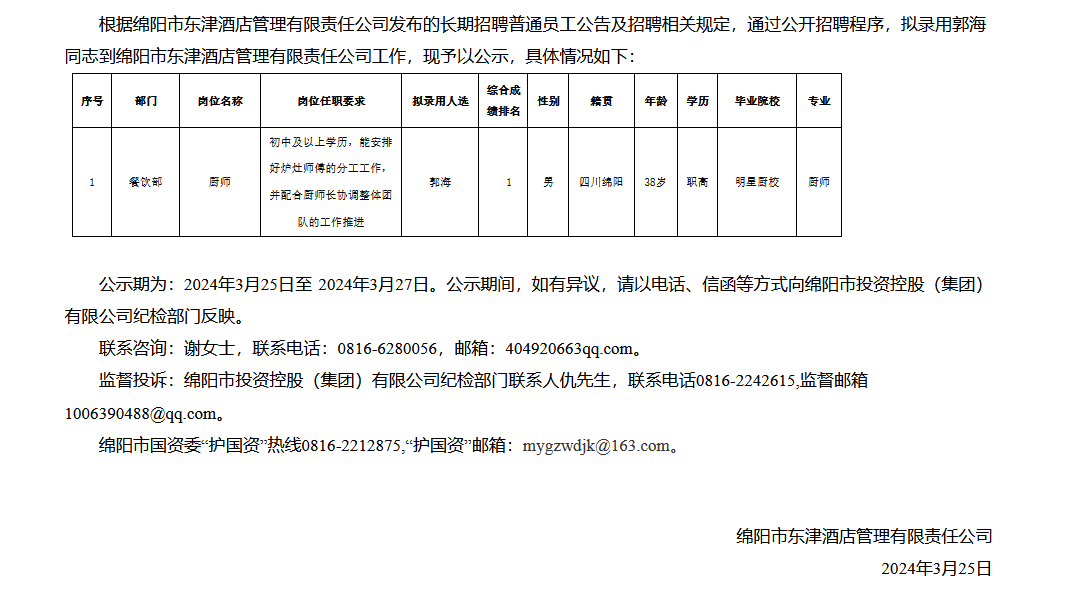 綿陽市東津酒店管理有限責(zé)任公司關(guān)于招聘酒店勤雜工擬錄用人員的公示