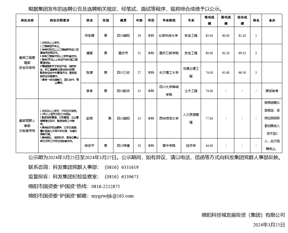 綿陽(yáng)科技城發(fā)展投資(集團(tuán))有限公司關(guān)于市場(chǎng)化選聘工作人員成績(jī)的公示