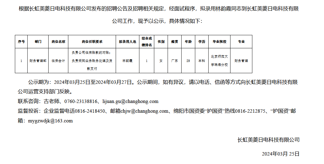 長(zhǎng)虹美菱日電科技有限公司關(guān)于招聘往來會(huì)計(jì)擬錄用人員的公示