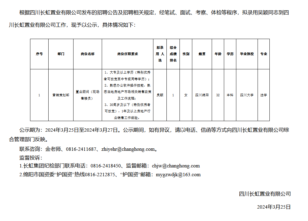 四川長(zhǎng)虹置業(yè)有限公司關(guān)于招聘置業(yè)顧問(wèn)(現(xiàn)場(chǎng)售樓員)擬錄用人員的公示