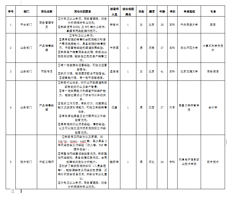 根據(jù)四川長虹佳華信息產品有限責任公司發(fā)布的招聘公告及招聘相關規(guī)定,經面試、考察、體檢等程序,擬錄用李培興、牛明圓、溫佳佳、況望、魏明輝同志到四川長虹佳華信息產品有限責任公司工作,現(xiàn)予以公示,具體情況如下: