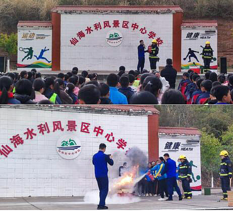 模擬火災(zāi)逃生。當(dāng)日上午10:05分,全體學(xué)生回到寢室做好準(zhǔn)備。10:15分,隨著煙霧的升起,警報(bào)的拉響,全校老師和宿管員迅速組織學(xué)生疏散逃生。各班按照指定路線,貓著腰,用濕毛巾、手、袖口等捂著口鼻迅速有序地進(jìn)行緊急疏散。全體師生迅速撤離到校園的安全地帶。消防官兵進(jìn)行了火災(zāi)的撲救工作及現(xiàn)場救援工作。