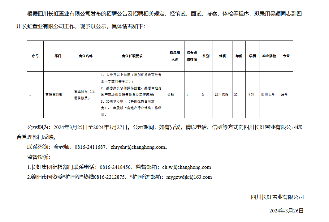 四川長虹置業(yè)有限公司關(guān)于招聘置業(yè)顧問(現(xiàn)場售樓員)擬錄用人員的公示
