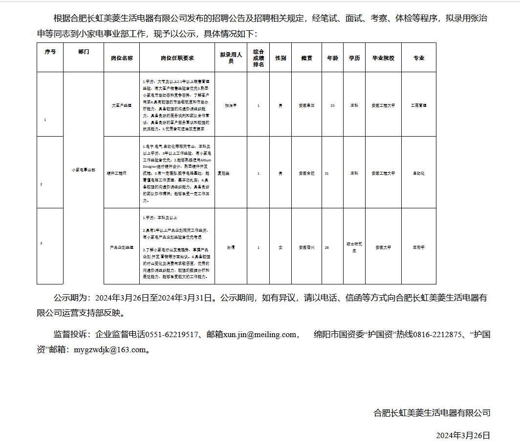 合肥長(zhǎng)虹美菱生活電器公司關(guān)于招聘大客戶經(jīng)理等崗位擬錄用人員的公示