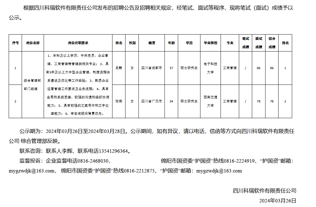 四川科瑞軟件有限責任公司關于招聘綜合管理部部門經(jīng)理成績的公示