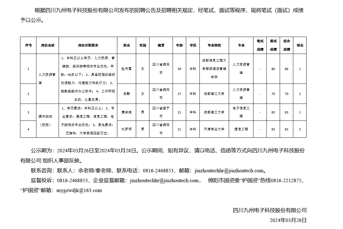 四川九州電子科技股份有限公司關(guān)于招聘人力資源管理等崗位成績(jī)的公示