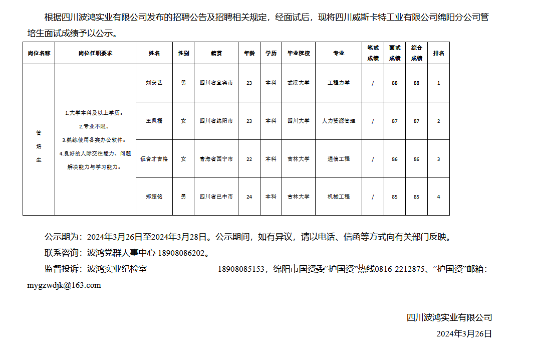 四川波鴻實(shí)業(yè)有限公司關(guān)于招聘四川威斯卡特工業(yè)有限公司綿陽(yáng)分公司管培生成績(jī)的公示