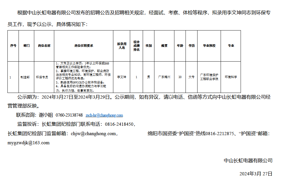 中山長虹電器有限公司關(guān)于招聘環(huán)保專員擬錄用人員的公示