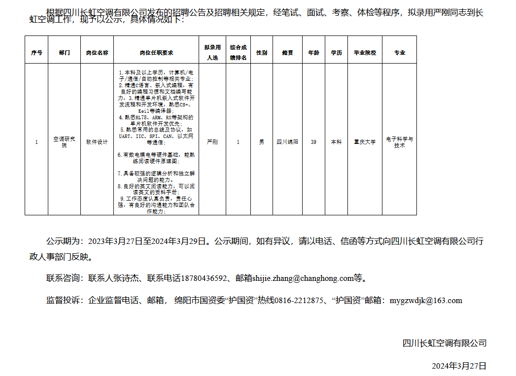 四川長虹空調(diào)有限公司關(guān)于招聘軟件設(shè)計崗位擬錄用人員的公示