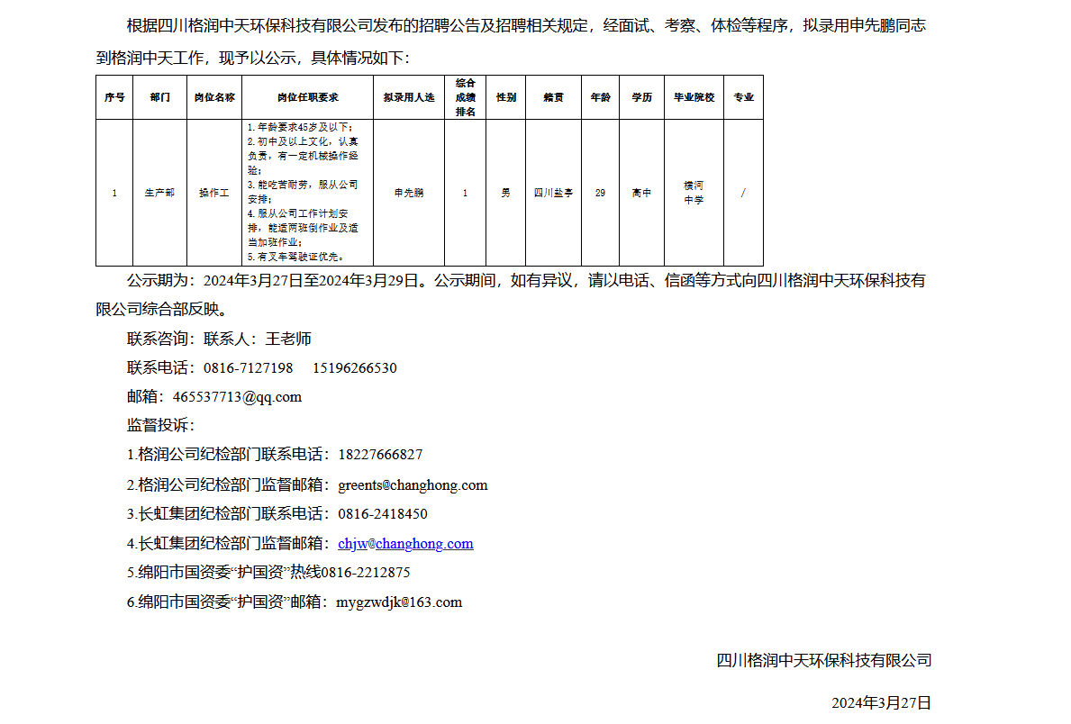 四川格潤中天環(huán)保科技有限公司關(guān)于招聘操作工擬錄用人員的公示