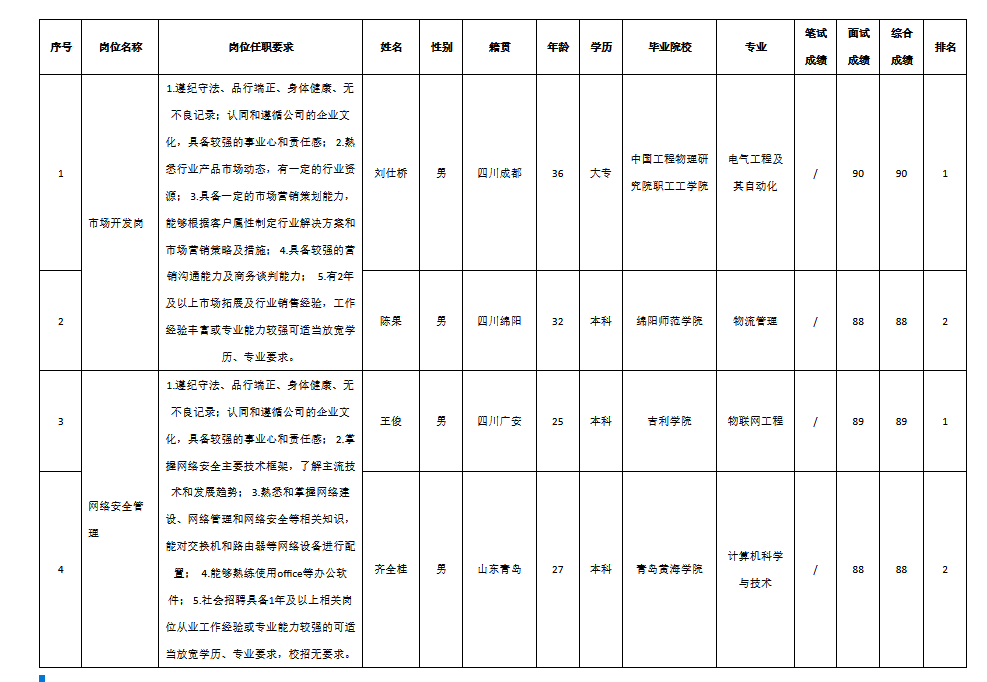 根據(jù)四川九強(qiáng)通信科技有限公司發(fā)布的招聘公告及招聘相關(guān)規(guī)定,經(jīng)筆試、面試等程序,現(xiàn)將筆試(面試)成績(jī)予以公示。