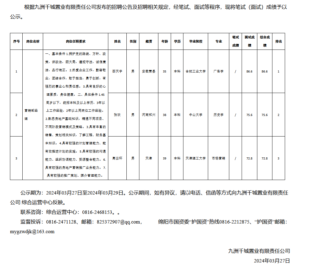 九洲千城置業(yè)有限責任公司關于招聘庫爾勒九洲千城置業(yè)有限責任公司營銷部經(jīng)理測試成績的公示
