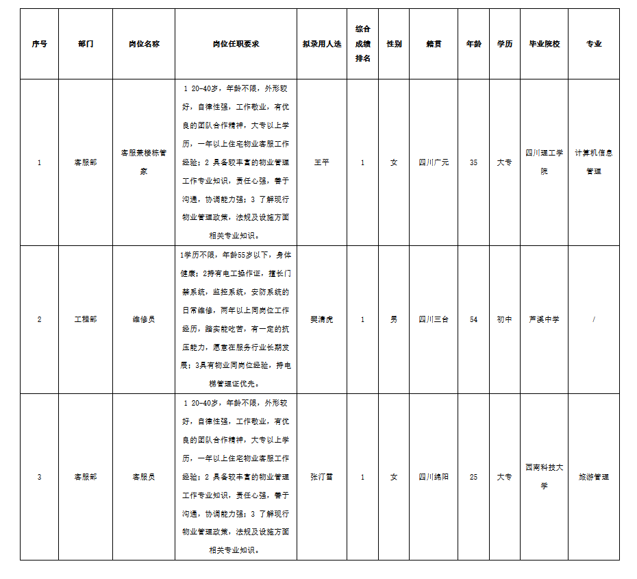 根據(jù)四川長虹物業(yè)服務(wù)有限責(zé)任公司綿陽分公司發(fā)布的招聘公告及招聘相關(guān)規(guī)定,經(jīng)筆試、面試、考察、體檢等程序,擬錄用王平、樊清虎、張汀雪到廣元天匯城管理處、國際城管理處、金嶺1號(hào)管理處工作,現(xiàn)予以公示,具體情況如下: