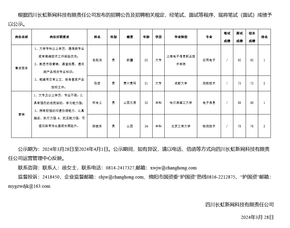 四川長(zhǎng)虹新網(wǎng)科技有限責(zé)任關(guān)于招聘售后服務(wù)等崗位測(cè)試成績(jī)的公示