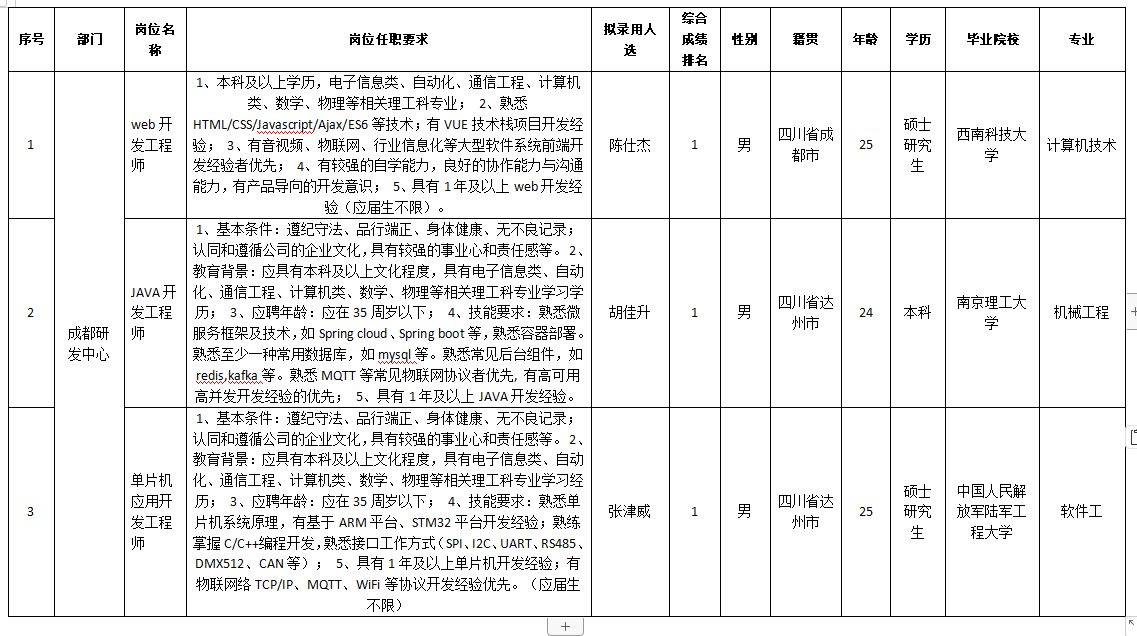 根據(jù)四川湖山電器股份有限公司發(fā)布的招聘公告及招聘相關(guān)規(guī)定,經(jīng)筆試、面試、考察、體檢等程序,擬錄用張津威,陳仕杰,胡佳升同志到四川湖山電器股份有限公司工作,現(xiàn)予以公示,具體情況如下: