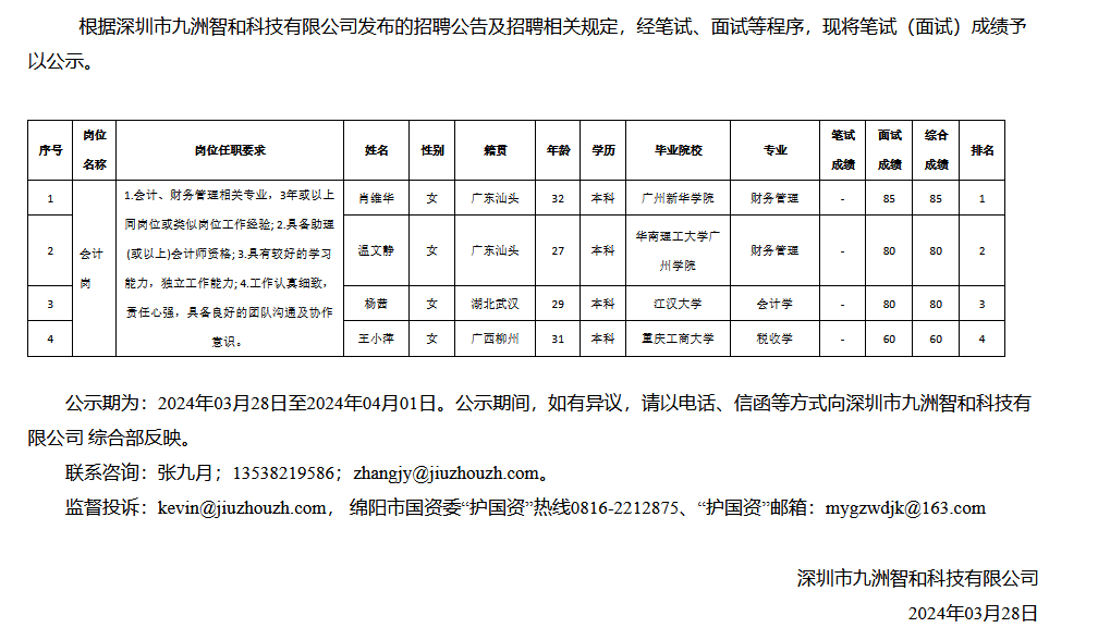 深圳市九洲智和科技有限公司關(guān)于招聘會計崗測試成績的公示