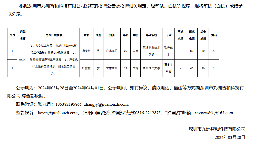 深圳市九洲智和科技有限公司關(guān)于招聘MC崗測試成績的公示